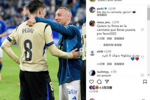 巴萨中场佩德里更新社媒动态,晒出与皇家奥维耶多40岁中场卡索拉的赛后合照,对其表达敬意,配文:“天才,能把你的球衣给我吗?”