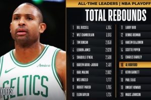 据统计,霍福德季后赛生涯总篮板来到了1536个(图片数据是比赛进行中的),超越加内特位居历史第16位。